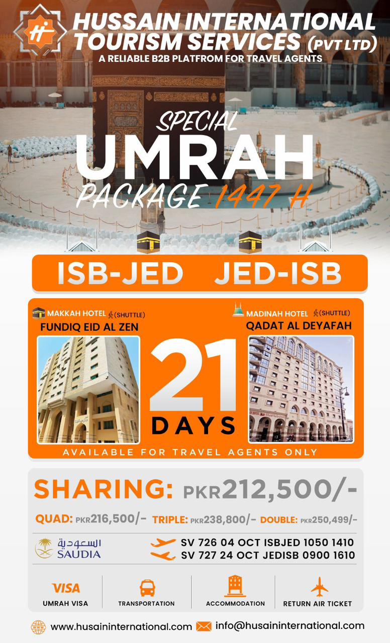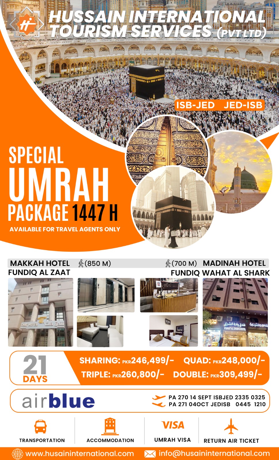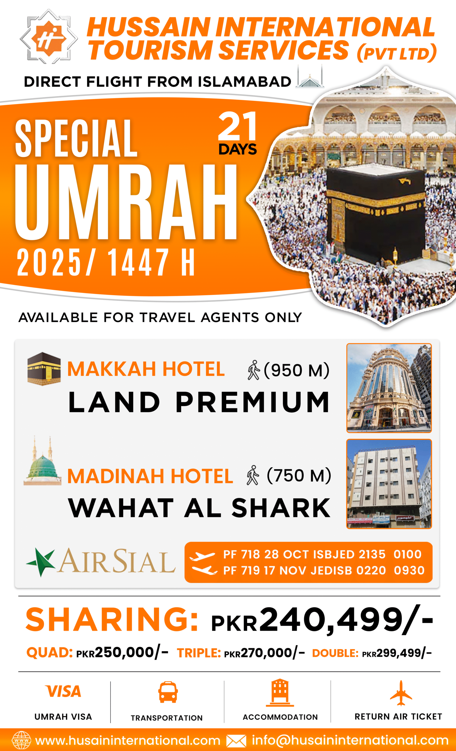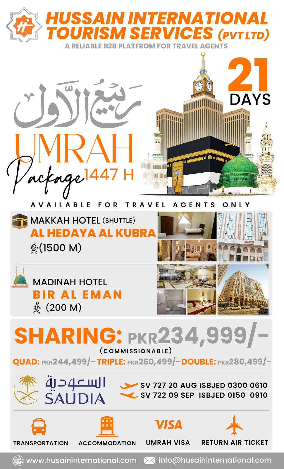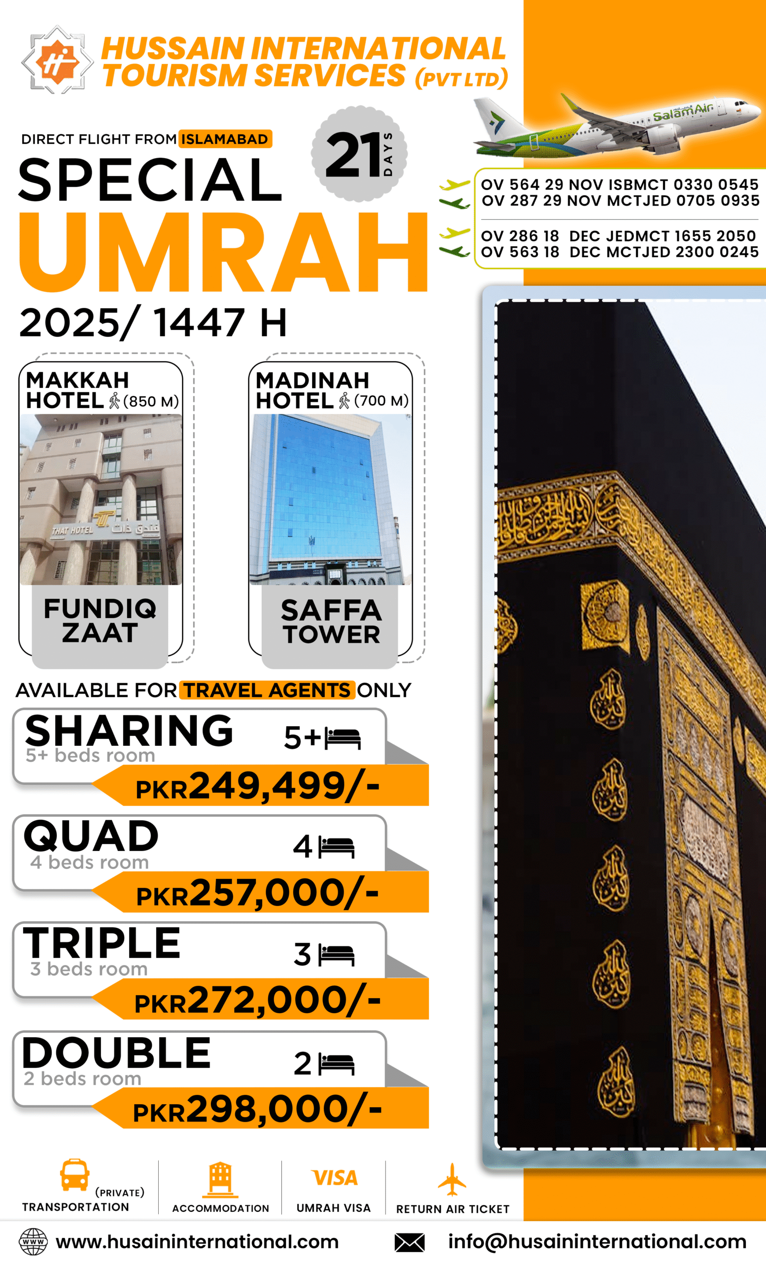 Embark on a sacred pilgrimage with our premium 21-day Umrah package**, meticulously designed to provide you with comfort, convenience, and an unforgettable spiritual experience. Priced at just PKR 220,999/-, this package offers exceptional value** with luxurious stays in prime locations, ensuring you can focus entirely on your devotion and prayers.